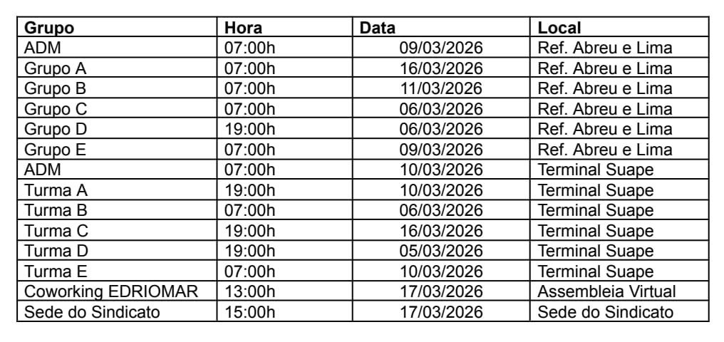 Pelo presente edital, o SINDICATO DOS TRABALHADORES NA INDÚSTRIA DE PETRÓLEO E GÁS NATURAL DOS ESTADOS DE PERNAMBUCO E PARAÍBA – SINDIPETRO-PE/PB, em conformidade com o §1º do artigo 11, com os §§ 1º e 2º do artigo 13; e com o artigo 14 e seus §§ 1º e 2º, do Estatuto da Entidade, CONVOCA os empregados e empregadas da ativa e aposentados e aposentadas das empresas Petróleo Brasileiro S/A –